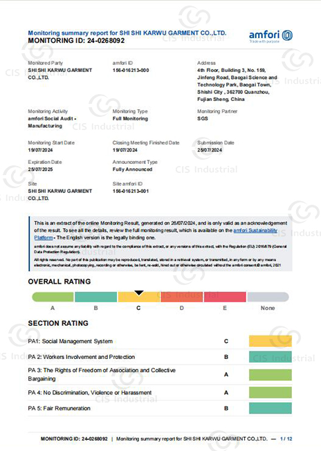 At CIS Sweater, we uphold a transparent and socially responsible supply chain, verified through internationally recognized audit systems. Our manufacturing facilities have undergone rigorous evaluation under theamfori BSCI monitoring system, reflecting our commitment to ethical production, fair labor practices, and systematic social compliance.