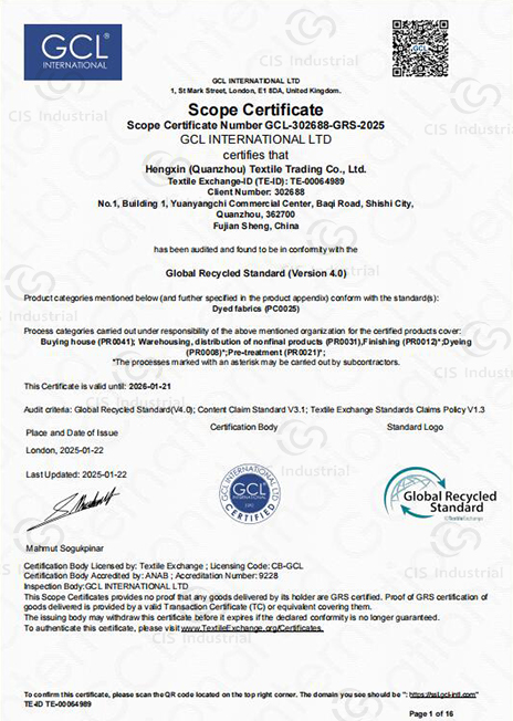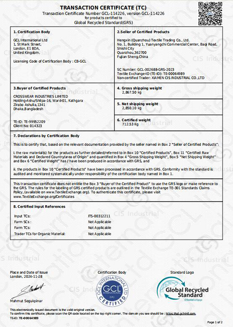 Transaction Certification (TC) Each GRS shipment is accompanied by a valid Transaction Certificate, providing full traceability from source to store.