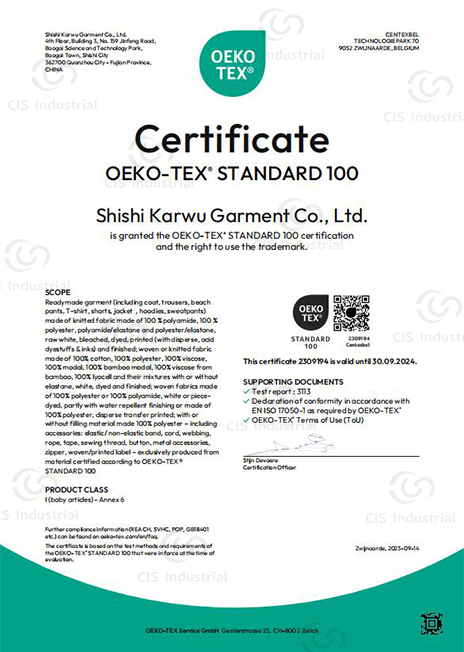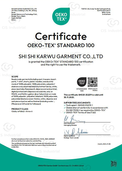 At CIS Sweater, we believe true quality means exceptional safety and environmental responsibility. That’s why our products are certified under the internationally recognized OEKO-TEX® STANDARD 100, guaranteeing they are free from harmful substances and safe for human ecological contact.