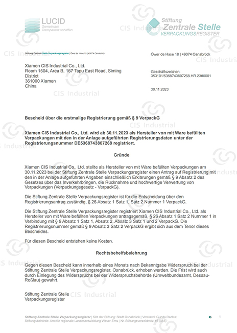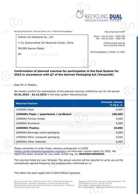 At CIS Industrial, we are fully compliant with international environmental regulations for packaging and textile recycling. Our company holds active registrations under Germany’s Packaging Act (VerpackG), France’s Extended Producer Responsibility (EPR) systems for both packaging and textiles, and Spanish Packaging EPR Certificate participates in certified recycling systems across Europe.