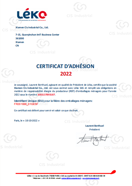 🇫🇷 French Packaging EPR Certificate Holder of Unique Identifier FPG01000_01GE5BF for household packaging compliance in 2022.