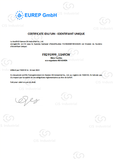 🇫🇷 French Textile EPR Certificate Registered with eco-organism REFASHION under Unique ID FR291999_11HFCW for textile recycling responsibility.