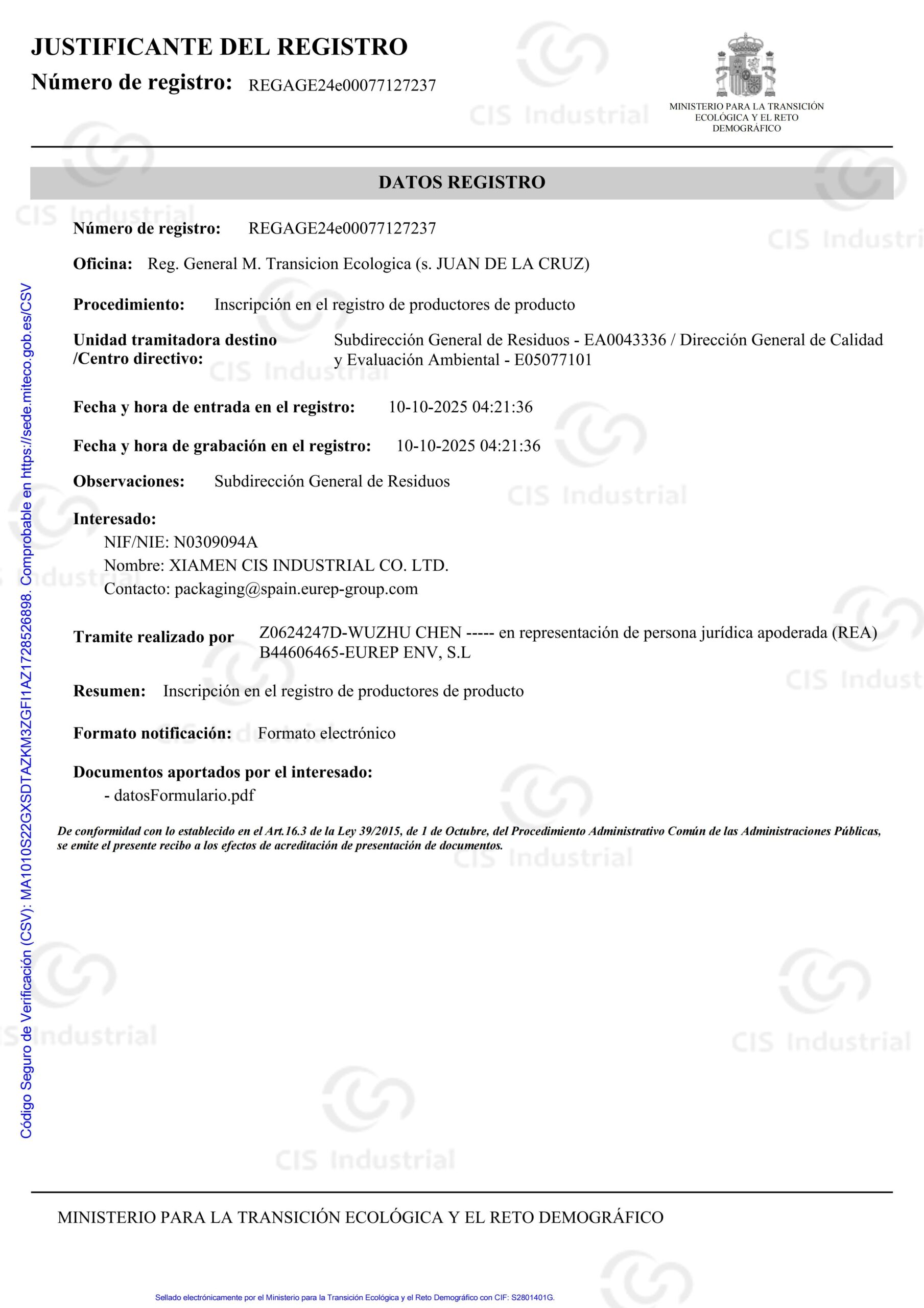 🇪🇸 Spanish Packaging EPR Certificate Registered with the Ministry of Ecological Transition under Unique ID REGAGE24e00077127237 for packaging waste compliance.