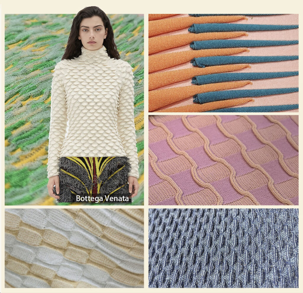 3D knit techniques craft dimensional effects. Density-modulated knitting crafts dimensional textures from needle-punched reliefs to sculptural adornments.